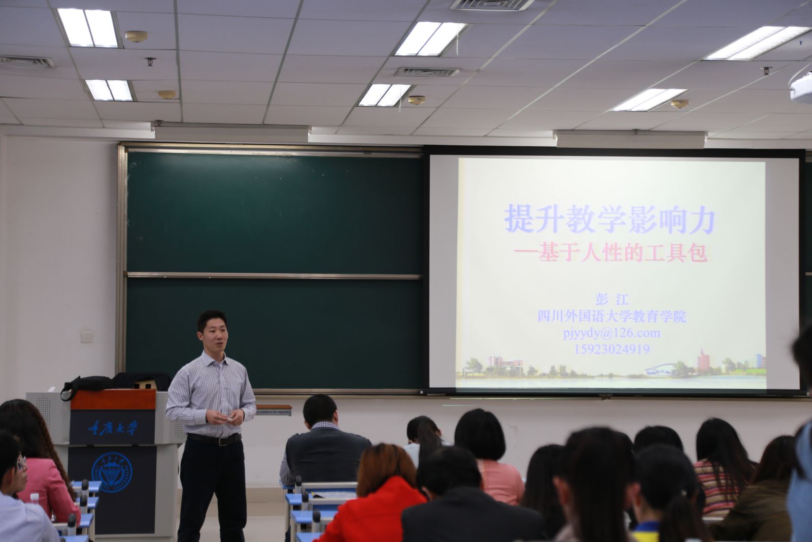 2016年4月20日下午,2016春季教师教学发展系列工作坊之“提升教学影响力——基于人性的工具包”在主教330教室成功举行。本次工作坊邀请了来自四川外国语大学彭江教授担任主讲。通过网上报名,全校多个学院的一线教师、课程负责人以及重庆其他高校的教师等100余人参加了工作坊。中心付红桥副主任担任工作坊主持并代表中心给彭江教授颁发了感谢信。