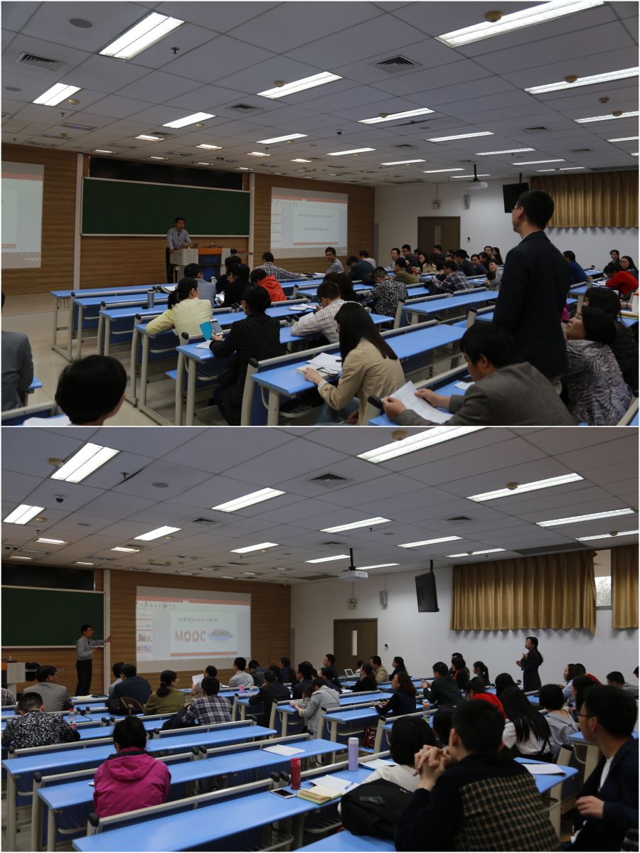 王帅国博士通过介绍什么是mooc、如何学习mooc课程以及mooc学习的益处来展示mooc在开放式教学中的重要性。通过教学案例的演示和现场讨论,让老师们更加深刻地体会到掌握mooc设计与技巧对于提高教学效率、改善教学效果的重要意义。
