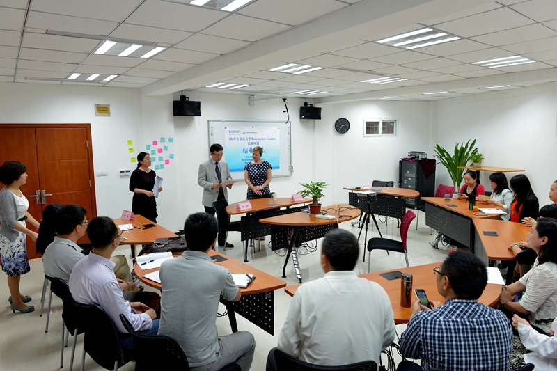 2015年10月21日下午,2015年重庆大学研究人员国际沟通力提升培训项目(Researcher Connect, 以下简称RC)结业典礼在教师教学发展中心举行。重庆大学副校长杨丹教授、英国驻重庆总领事馆文化教育处文化教育领事Dawn Long女士、英国总领事馆文化教育处西南地区助理主任陈兵先生和英语项目高级官员黎瑞先生以及部分学员代表出席了结业典礼,杨丹副校长和Dawn Long女士共同为学员颁发了结业证书,教师教学发展中心副主任彭静教授担任主持。
