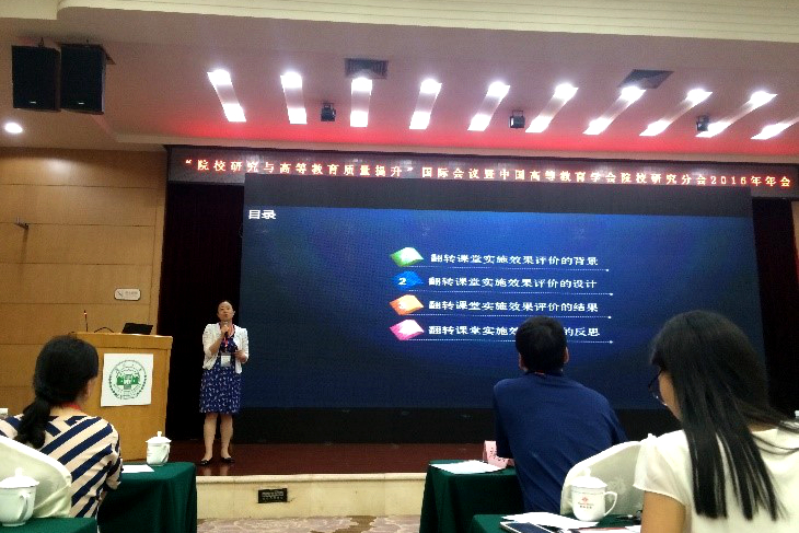 本次研讨会的主要内容包含高校发展战略实施与评估、高校课程建设与教学改革、本科生学习与发展测评、院校研究的理论与方法。受主办方邀请,彭静做了题为“翻转课堂实施效果评价的探索-以重庆大学为例”的主题报告,介绍了我校在进行翻转课堂试点工作的过程中,对其实施效果评价的探索和研究。彭静教授从研究背景、评价对象、评价方法、数据收集以及研究框架等方面对该项研究做了一个整体的介绍,随后,李珩博士重点就研究中所采集的数据进行了解读和总结。