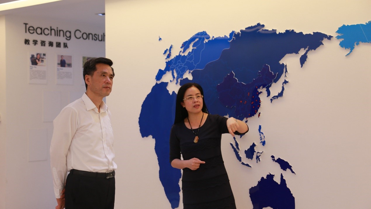 周旬在中心主任彭静的陪同下参观了中心的多媒体教室、微格教室、教学文化墙等硬件,走访了业务办公室、综合办公室、培训助理办公室等部门,在参观和走访的过程中听取了彭静关于教师培训、教学评价、教学咨询等中心主要工作的汇报,并询问了中心青年教师的工作与生活状况。